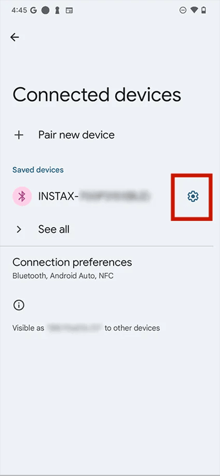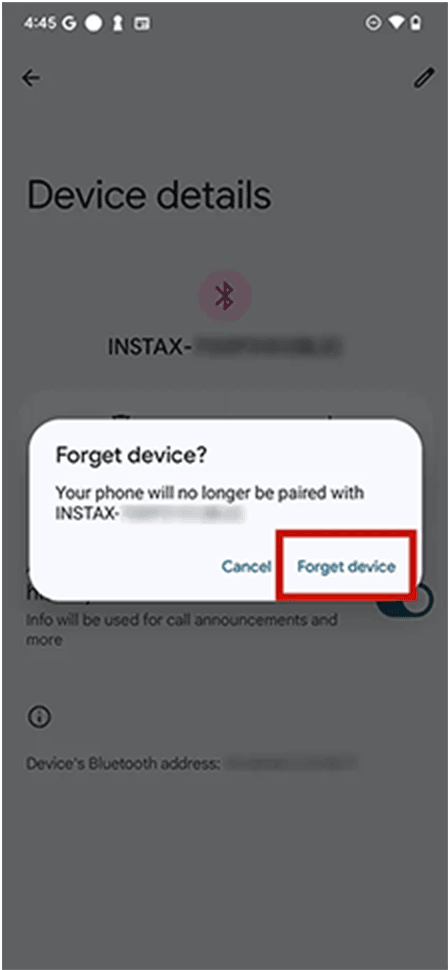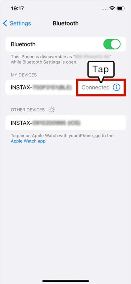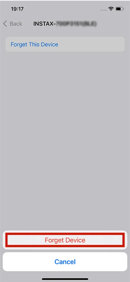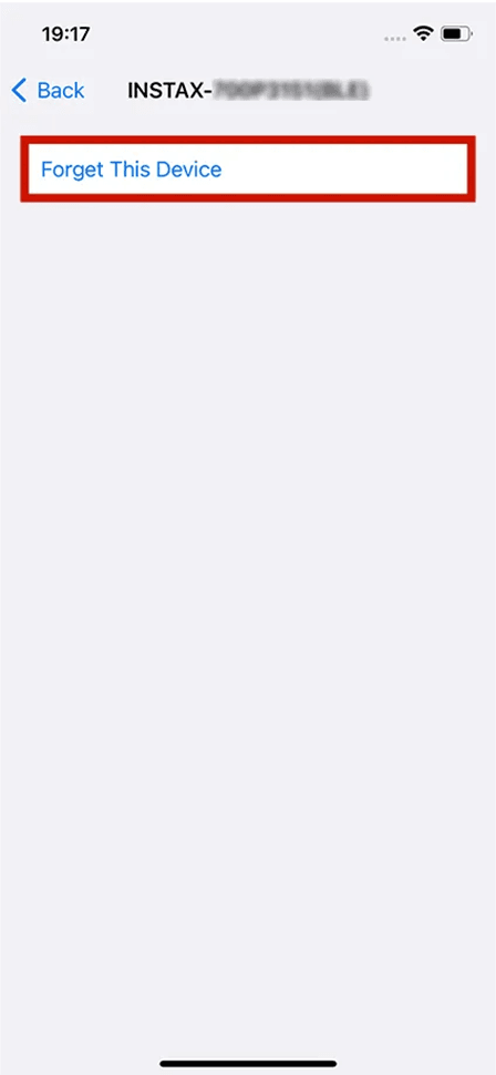 ⇒ If “Unpair” cannot be selected, no action is required. - Open the Bluetooth settings screen on your smartphone. Check if a previously-connected instax mini Evo Cinema™ is displayed.