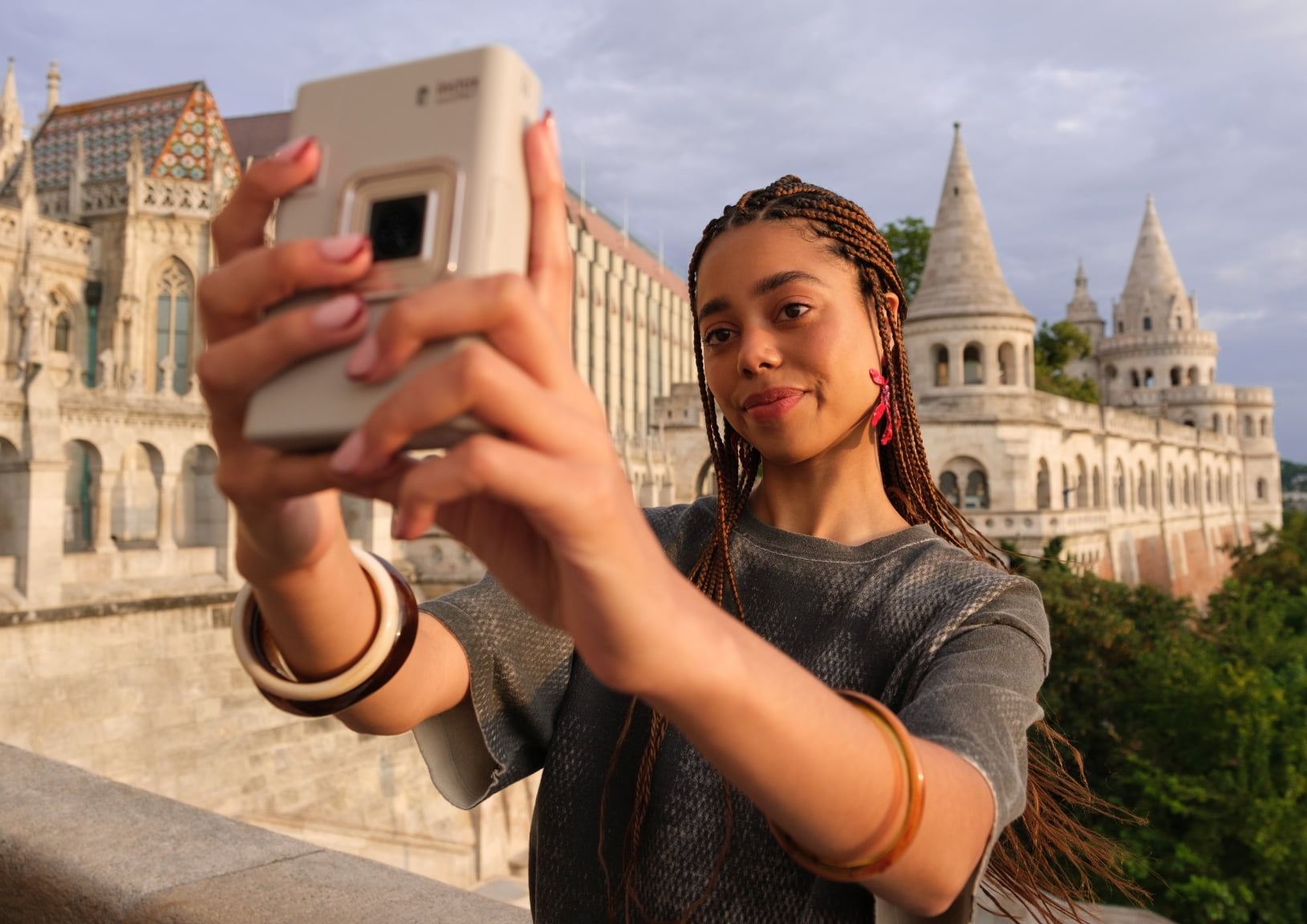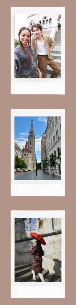 Create instax™ photos of your special memories by combining a selfie with a scenic background image! Choose from four different layouts.