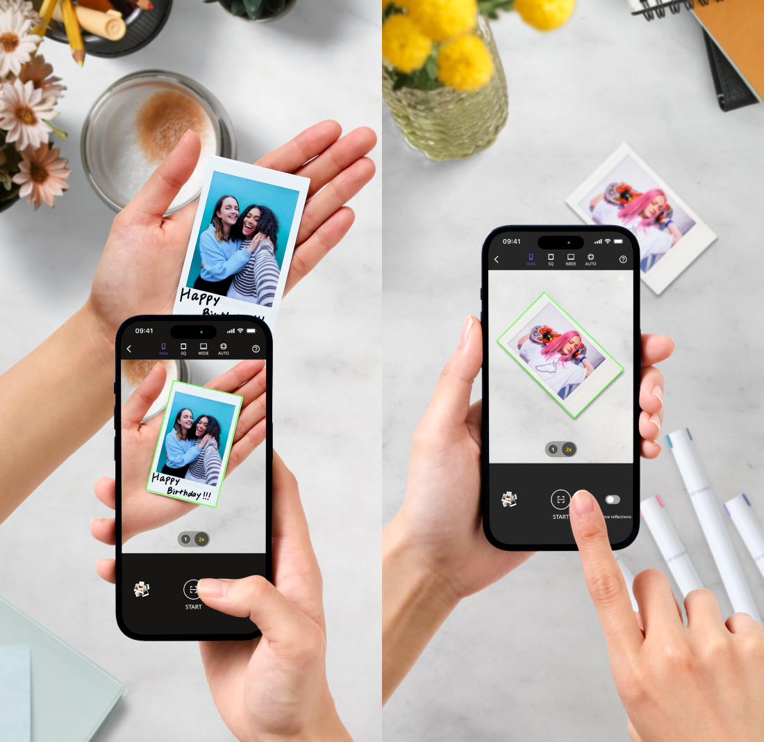 Con l'introduzione dell'intelligenza artificiale, ora puoi scansionare una foto instax™ indipendentemente dallo sfondo o dall'angolazione, persino tenendola in mano.